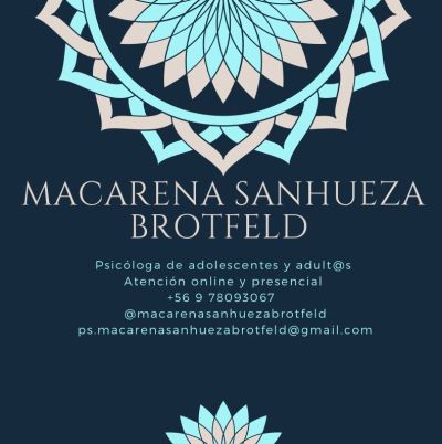 Macarena Sanhueza Brotfeld es psicóloga clínica de adultos y adolescentes. Realiza atenciones terapéuticas hace más de 10 años, acompañando y facilitando los procesos de cambio que viven las personas o parejas para otorgarles la oportunidad de contar con una visión alternativa que amplíe sus posibilidades. .